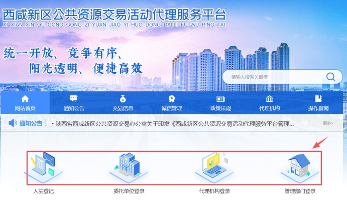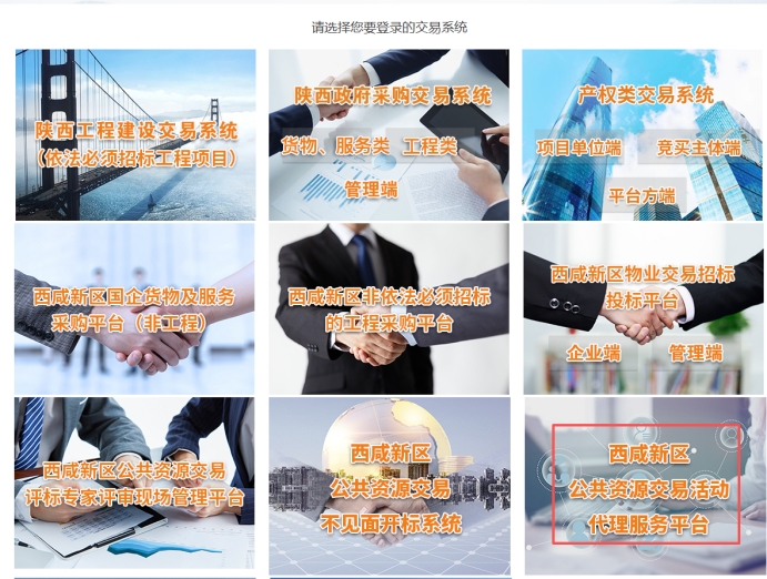 平台登录:全国公共资源交易中心·西咸新区网站首页→电子交易平台→拉至最下方点“我已阅读”→第三排最后一个“西咸新区公共资源交易活动代理服务平台”,按照相应的身份选择登录端口。如果有账号登录、下载插件、注册失败等问题请咨询400-850-3300国泰新点技术专线。