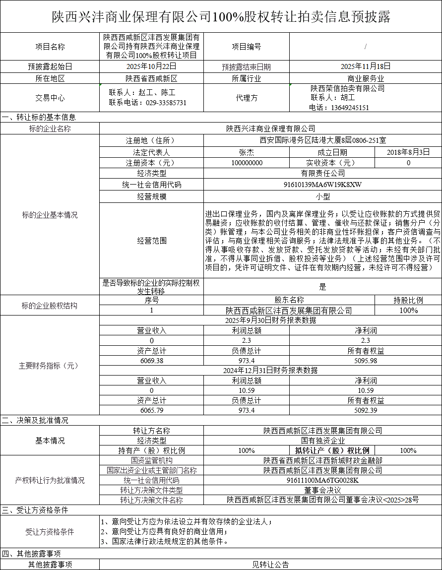 陕西兴沣商业保理有限公司100%股权转让拍卖信息预披露