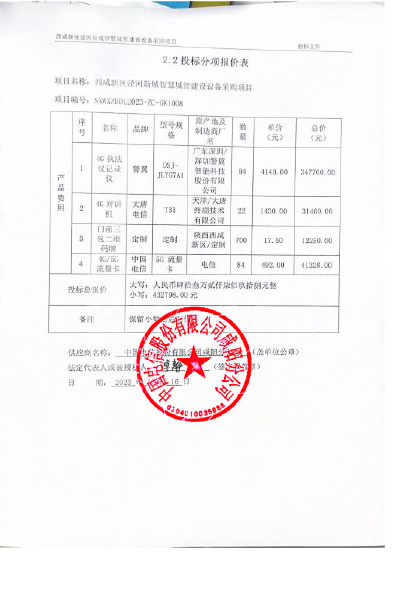 | 1 | 执法记录仪 | 4G执法记录仪、4G对讲机、二维码牌、4G/5G流量SIM卡 | 警翼、大唐电信 | 4G执法记录仪84台、4G对讲机22台、门前三包二维码牌700个、4G/5G流量SIM卡84个 | 1.00(台) | 432,798.00 | 432,798.00 |